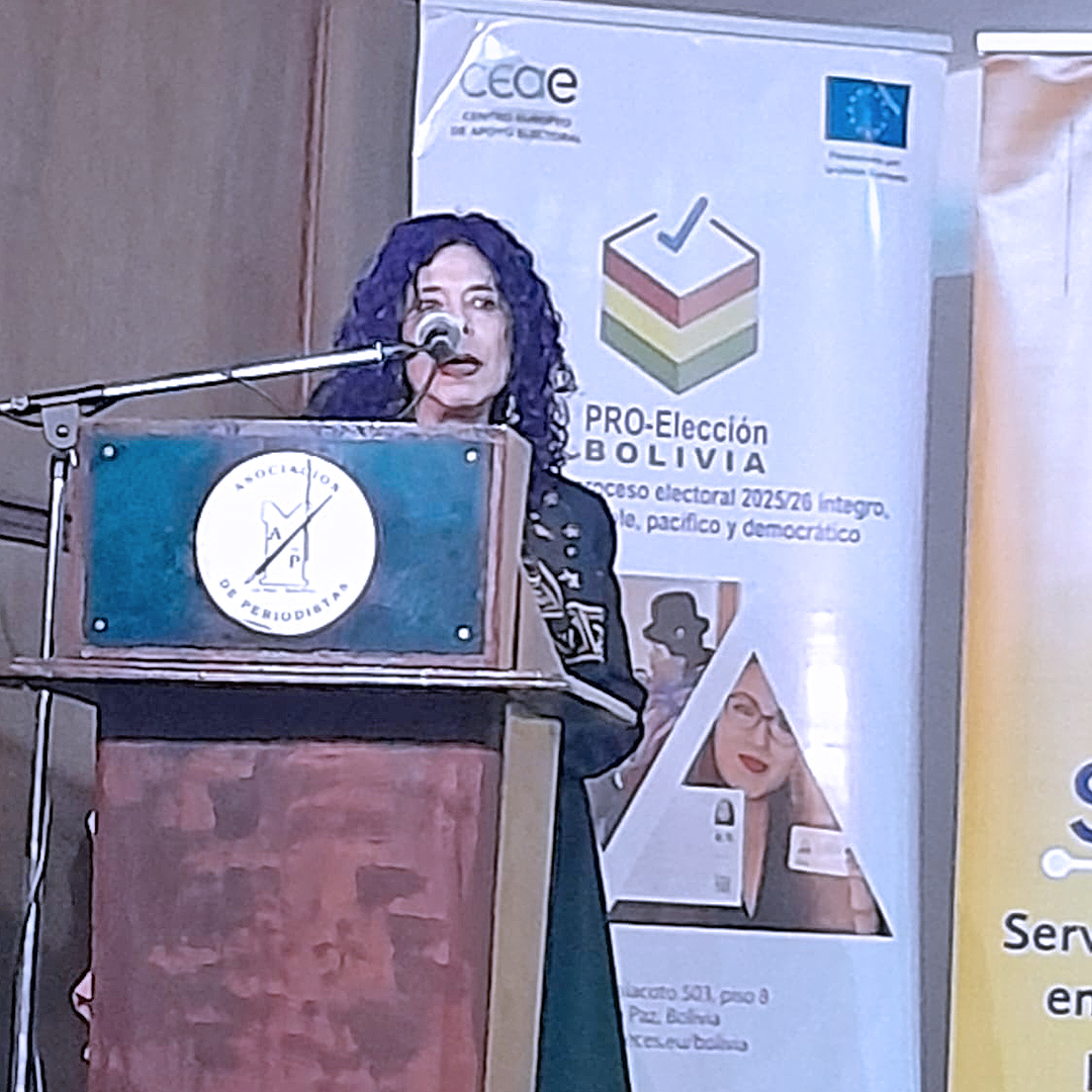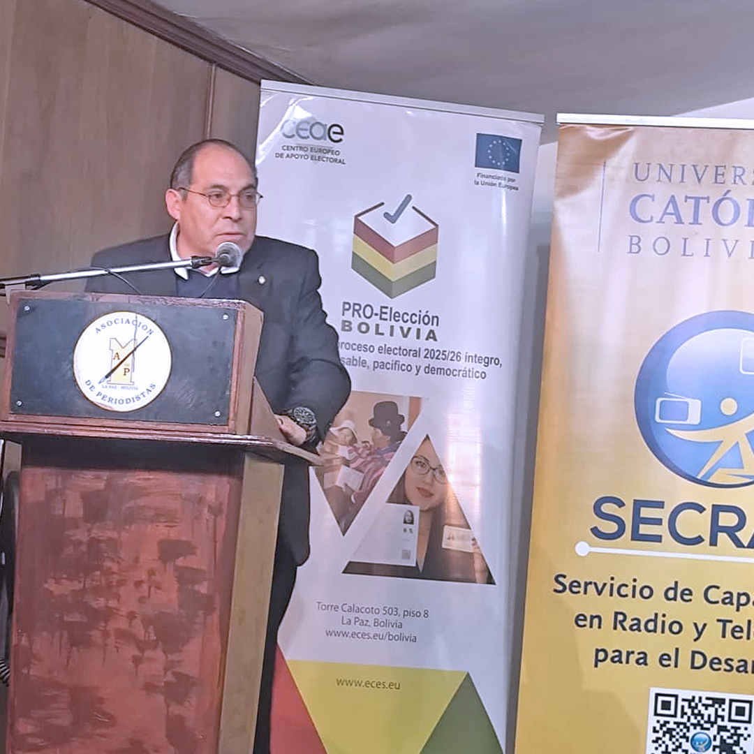 The seminar opened with remarks from Nidya Pesántez, UN Women Representative in Bolivia; Sara Macharia from World Association for Christian Communication (WACC), who joined virtually; José Luis Aguirre Alvis, former Vice President of WACC World; and Patricia Flores, President of the Circle of Women Journalists of La Paz who highlighted the importance of ECES’ commitment to press freedom, pluralism and the protection of women journalists, particularly in electoral contexts where risks and intimidation are heightened.